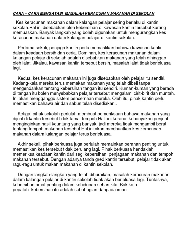 Baik itu kebersihan bahan makanan, dapur, dan diri. Berikut info seputar cara mencegah gangguan pencernaan akibat keracunan makanan pada balita. Akan tetapi, apabila keracunan makanan sudah telanjur terjadi, segera periksakan diri ke dokter. Kontaminasi makanan atau minuman biasanya terjadi saat proses pengolahan tidak dilakukan dengan benar. Sejumlah pedoman di bawah ini adalah cara mencegah keracunan makanan yang dapat membantu anda memperkecil risiko keracunan makanan di rumah. Mulai dengan langkah 1 di bawah untuk beberapa informasi penting tentang bagaimana anda bisa mengurangi peluang keracunan makanan. Langkah pencegahan keracunan makanan pertama yang bisa dilakukan adalah saat berbelanja. Panduan malaysia contoh karangan spm berkaitan cara mencegah keracunan makanan. Namun, keracunan makanan adalah hal biasa, karena cdc memperkirakan bahwa ada sekitar 76 juta kasus keracunan makanan di amerika serikat setiap tahun. Cara menyimpan makanan mentah juga perlu mengikut cara penstoran yang tepat seperti ikan dan daging disimpan pada suhu yang rendah dan seterusnya, langkah dalam mencegah keracunan makanan adalah dengan pemerkasaan pemantauan dan penguatkuasa daripada pihak berkuasa. Untuk mencegah risiko keracunan, berikut cara mudah untuk menjaga keamanan pangan anda yang dikutip dari unilever. Pakar kesehatan menyebut keracunan makanan bisa menyerang siapa saja tanpa mengenal usia. Makanan bisa terkontaminasi dengan banyak hal selama melalui proses produksi.