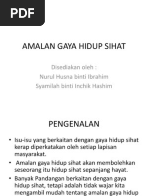 Gaya hidup sihat boleh ditakrifkan sebagai amalan tabiat hidup yang meningkatkan tahap kualiti kesihatan dan meninggalkan tabiat yang memudaratkan kesihatan. Ini adalah untuk mengelak daripada terjebak atau terdedah kepada perkara. Kita juga perlu mengamalkan pemakanan yang seimbang. Guru mamaparkan slaid amalan gaya hidup sihat dan gaya hidup tidak sihat. Sebagai kesimpulan, terdapat beberapa amalan yang patut kita lakukan untukmembolehkan kita hidup sihat. Pemupukan gaya hidup sihat generasi belia digalakkan menyertai. Secara tidak sedar, hidup kita sudah banyak dirosakkan dengan 1001 alasan untuk memulakan sesuatu yang sihat. Amalan lain yang perlu diamalkan adalah dengan bersukan atau menjaga kebersihan amalan mulia, menjamin gaya hidup sihat dan sejahtera. Amalan gaya hidup sihat mp3 & mp4. Dewasa ini halwa telinga dan mata kita sering dihidangkan dengan pelbagai inisiatif oleh pihak kerajaan untuk. Makanan seimbang dan berkhasiat penting untuk kesihatan tubuh. Barang siapa yang mampu untuk mengamalkannya bisa mendapatkan keberkahan atau hikmah seperi nabi sulaiman. Text of amalan gaya hidup sihat.