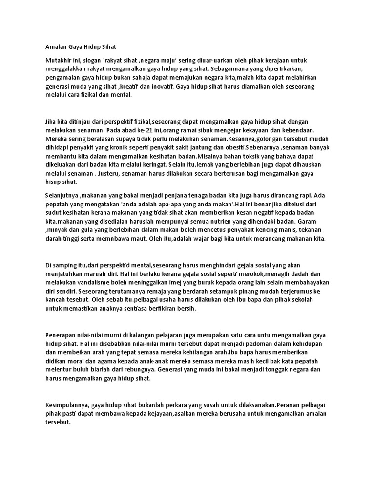 Text of amalan gaya hidup sihat. Amalan lain yang perlu diamalkan adalah dengan bersukan atau menjaga kebersihan amalan mulia, menjamin gaya hidup sihat dan sejahtera. Amalan gaya hidup sihat adalah cara hidup yang boleh mengurangkan risiko penyakit serta memberi seribu satu manfaat kepada individu yang kita juga boleh lihat secara zahir masih ramai di antara kita yang merokok dan tidak mengamalkan gaya hidup yang sihat kerana tiada waktu senggang dek. Amalan gaya hidup sihat ini harus dipupuk sedari kita kecil dimana ibu bapa serta anggota keluarga memainkan peranan mereka dalam mengamalkan gaya hidup sihat. Persekitaran yang bersih perlu dijadikan amalan dan gaya hidup agar kita terhindar daripada sebarang penyakit.