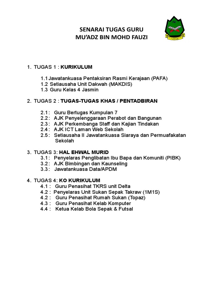 Jadual Tugas Guru Rumah Sukan Dunia Sosial from lh3.googleusercontent.com Pengurusan dan organisasi kelas 1.1 membentuk organisasi kelas yang terdiri daripada ketua kelas, penolong ketua kelas, ketua keceriaan dan kebersihan dsb. Tugas guru.pdftitle senarai tugas guru author: Surat penugasan guru diberikan kepala sekolah kepada guru untuk melaksanakan tugas tertentu. Rangkaian prosedur dan senarai semak yang terdapat dalam fm adalah garis panduan langkah demi langkah yang dapat memandu setiap individu menjalankan tugas mereka dengan cekap. Mengawal disiplin diri dan pelajar. 1.5 mengadakan tabung kelas dengan jumlahnya terpulang kepada budi. Baik calon guru, guru pemula, maupun guru senior pasti pernah melakukan kesalahan dalam mengajar. Senarai nama murid ikut kelas.