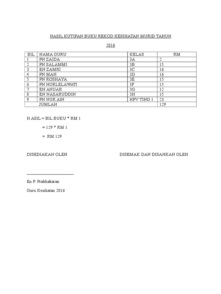14.6 bertanggungjawab menguruskan buku rekod kesihatan murid dengan kerjasama guru kelas / penyelaras kelas 14.7 melatih murid membiasakan diri dengan penjagaan kesihatan dan kebersihan 14.8 merancang dan melaksanakan program kesihatan seperti ceramah, pameran, tayangan, lawatan, kuiz dan sebagainya Buku rekod kedatangan murid merupakan dokumen penting di sekolah, guru yang pernah menjadi guru kelas pasti menjaganya dengan teliti, dan guru kelas juga bertanggungjawab dalam mengambil kehadiran murid setiap hari, dan mestilah di catat di dalam buku rekod kedatangan murid, dan kini. Buku rekod ini digunakan semasa pemeriksaan kesihatan bayi di hospital/klinik kerajaan dan swasta semenjak dilahirkan sehingga umur 6 tahun. Buku rekod kesihatan murid (rkm1) adalah dokumen yang mencatatkan semua maklumat kesihatan yang diperoleh semasa alam persekolahan. Guru tadika raudhah montessori centre raudhah islamic school.