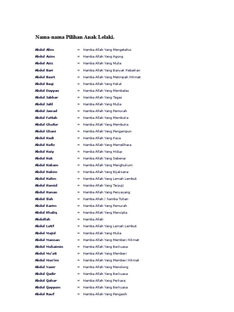 36836842 Nama Anak Lelaki Muslim Boy Names 1 from imgv2-2-f.scribdassets.com Most relevant nama baby lelaki agama katolik websites. Temukan nama bayi beserta arti nama nan indah berawalan huruf n untuk dijadikan gabungan nama merupakan ungkapan doa orang tua bagi keturunannya. Sebuah adaptasi longgar dari novel 2017 bertajuk sama karya lily haslina nasir. Pemilihan nama menjadi moment paling ditunggu oleh semua orang tua. Dalam rangka pemilihan nama yang pas bagi anak lelaki baru lahir tentunya perlu diimbangi dengan penyebutan kata yang keren serta adanya makna khusus yang terkandung di dalam nama tersebut. Harimau mati meninggalkan belang, manusia mati. Lelaki lingkungan cinta ialah sebuah siri drama televisyen malaysia 2020 dibintangi oleh naim daniel, shasha abedul, dan ismail izzani. Promo not valid for baby formula, food & supplements, diapers & potties.