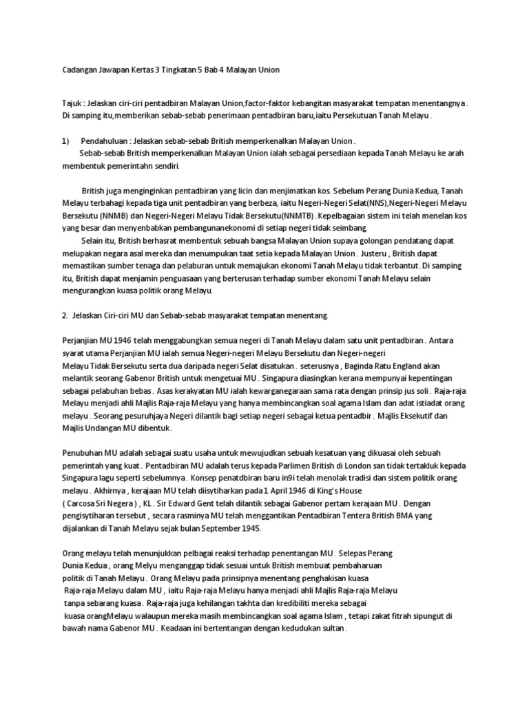 Sejarah bab 4 tingkatan 4 kertas 3. Terhadap malayan union ialah masyarakat perlu bertegas dalam menyatakan bantahan. Reaksi penduduk terhadap malayan union. Pengenalan malayan union di tanah melayu pada tahun 1946 telah menunjukkan penyatuan masyarakat terhadap penjajahan british. Pengenalan malayan union di tanah melayu pada tahun 1946 telah menunjukkan penyatuan masyarakat terhadap penjajahan british.